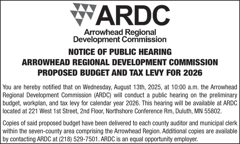 Jul 25, 2025. Arrowhead Regional Development Commission Government Ads from Mesabi Daily News