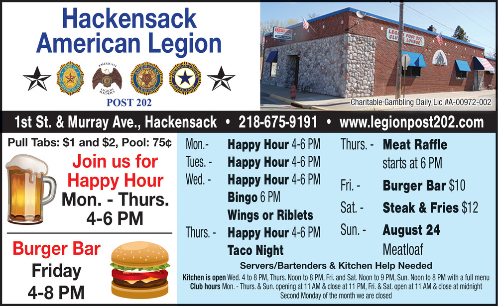 218-675-91911st St. & Murray AveHackensack, MN 56452(Legion)