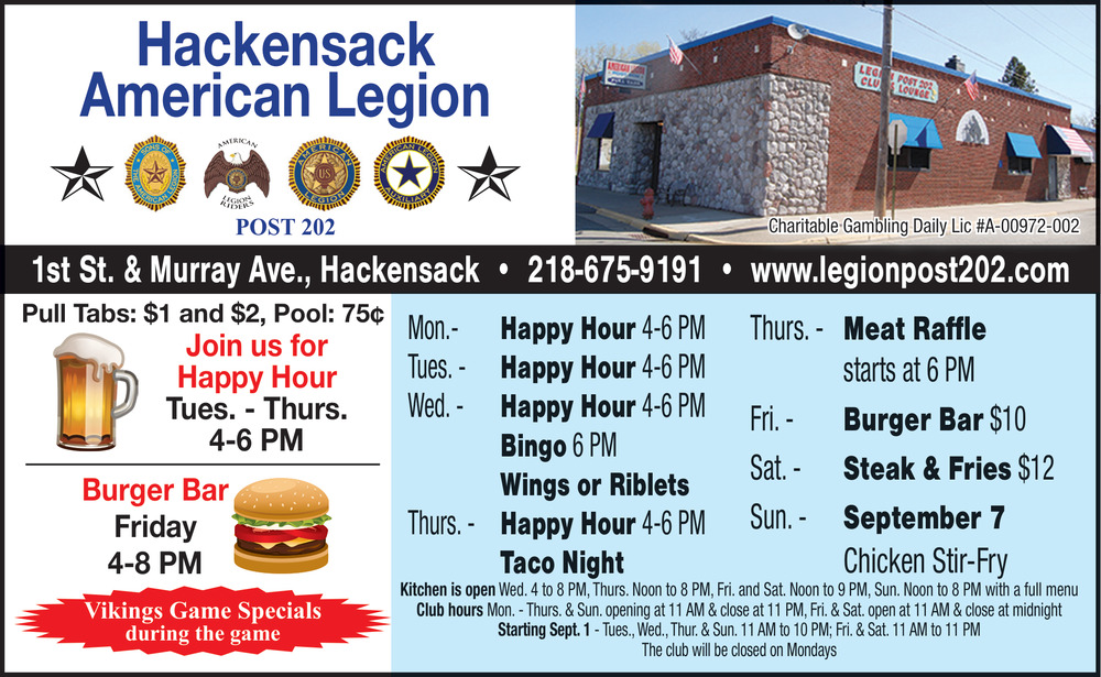 218-675-91911st St. & Murray AveHackensack, MN 56452(Legion)