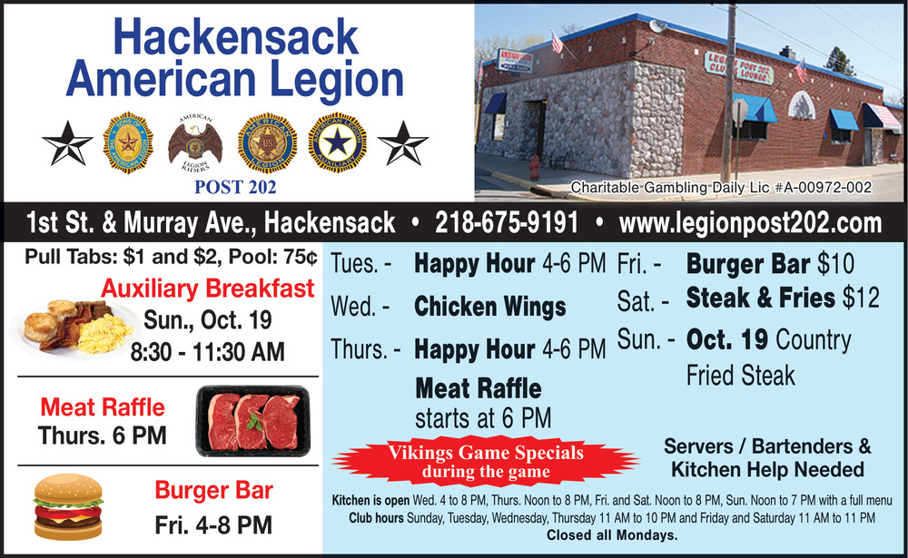 218-675-91911st St. & Murray AveHackensack, MN 56452(Legion)