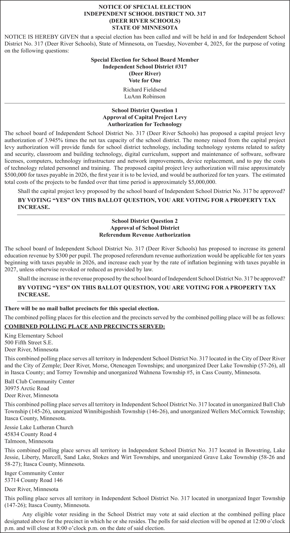 Special Election in Deer River, MN