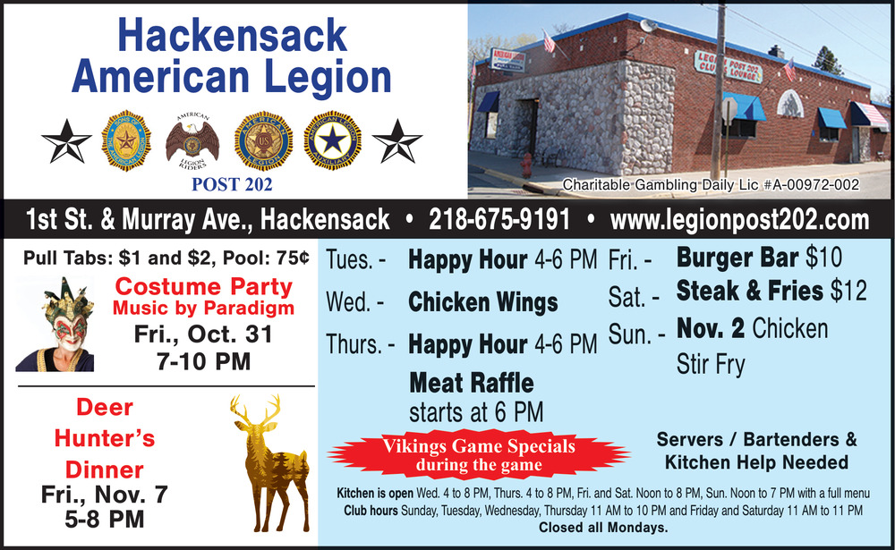 218-675-91911st St. & Murray AveHackensack, MN 56452(Legion)