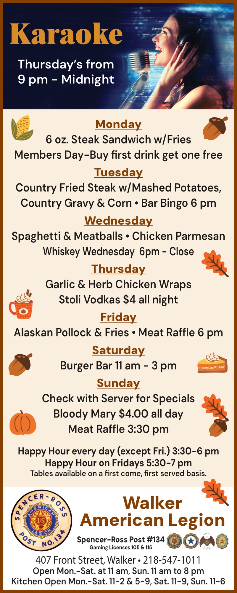 Nov 05, 2025. Walker American Legion Events Ads from The Pilot Independent