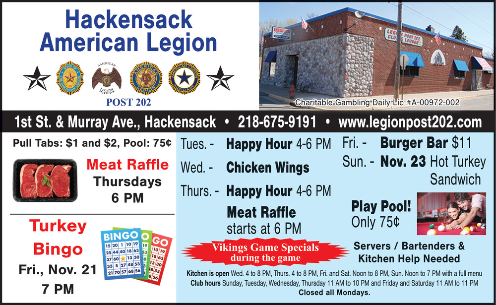 218-675-91911st St. & Murray AveHackensack, MN 56452(Legion)