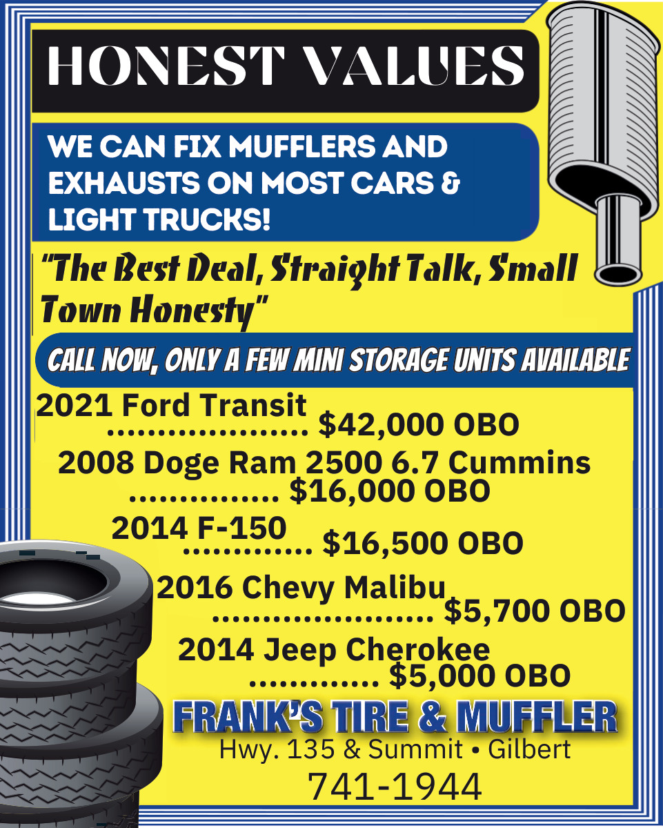 Ads for Frank's Tire & Muffler in Gilbert, MN