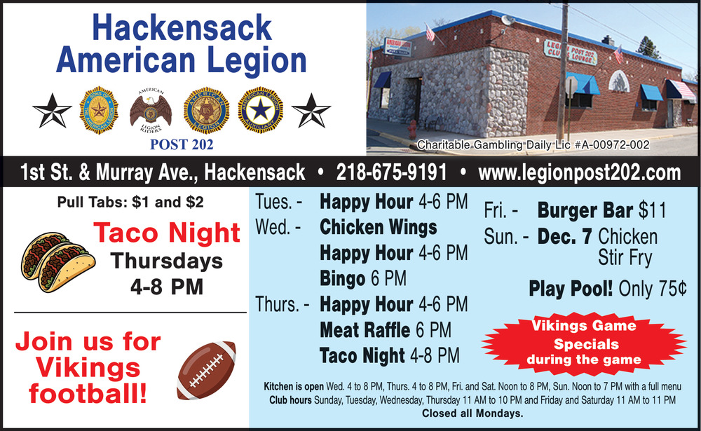 218-675-91911st St. & Murray AveHackensack, MN 56452(Legion)