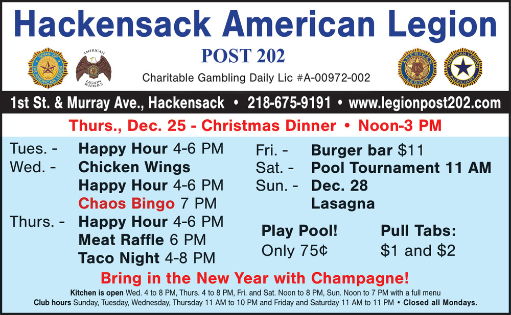 218-675-91911st St. & Murray AveHackensack, MN 56452(Legion)