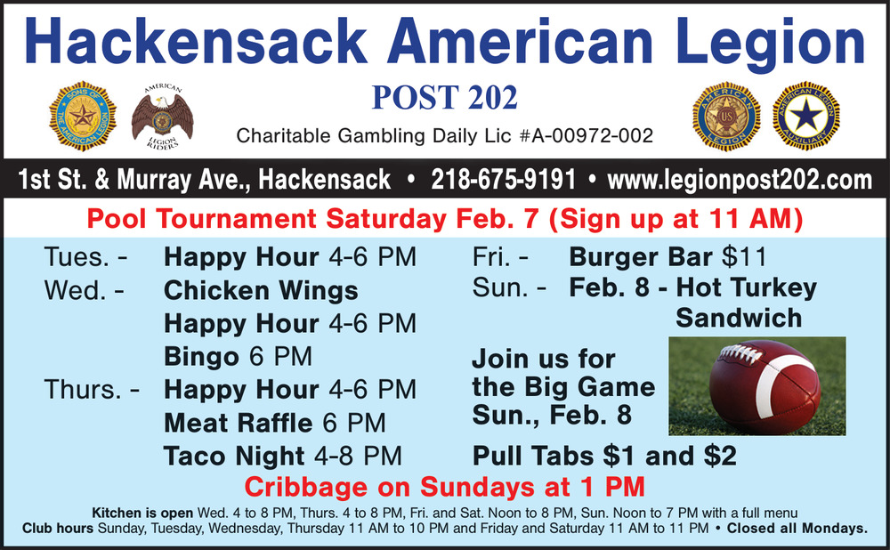 218-675-91911st St. & Murray AveHackensack, MN 56452(Legion)
