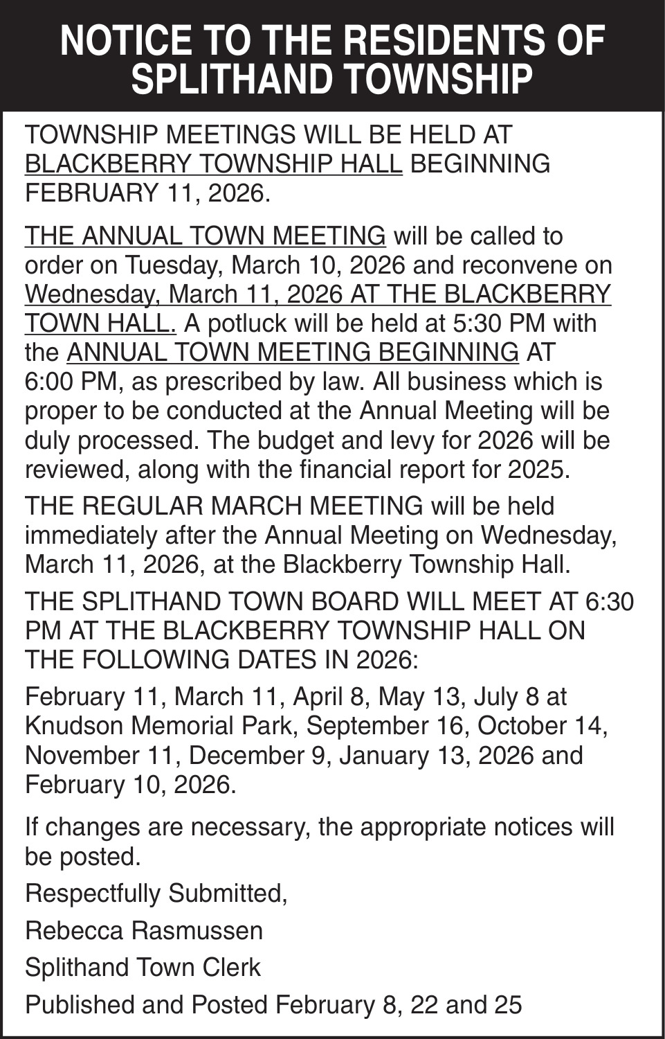 Notice to the Residents of Splithand Township