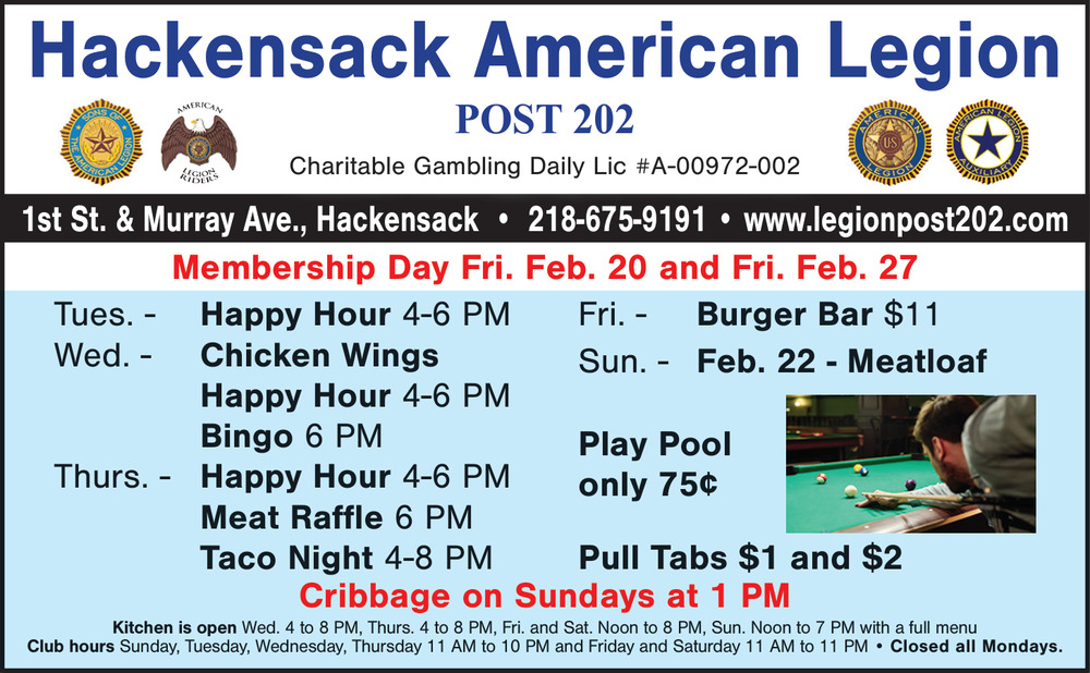 218-675-91911st St. & Murray AveHackensack, MN 56452(Legion)