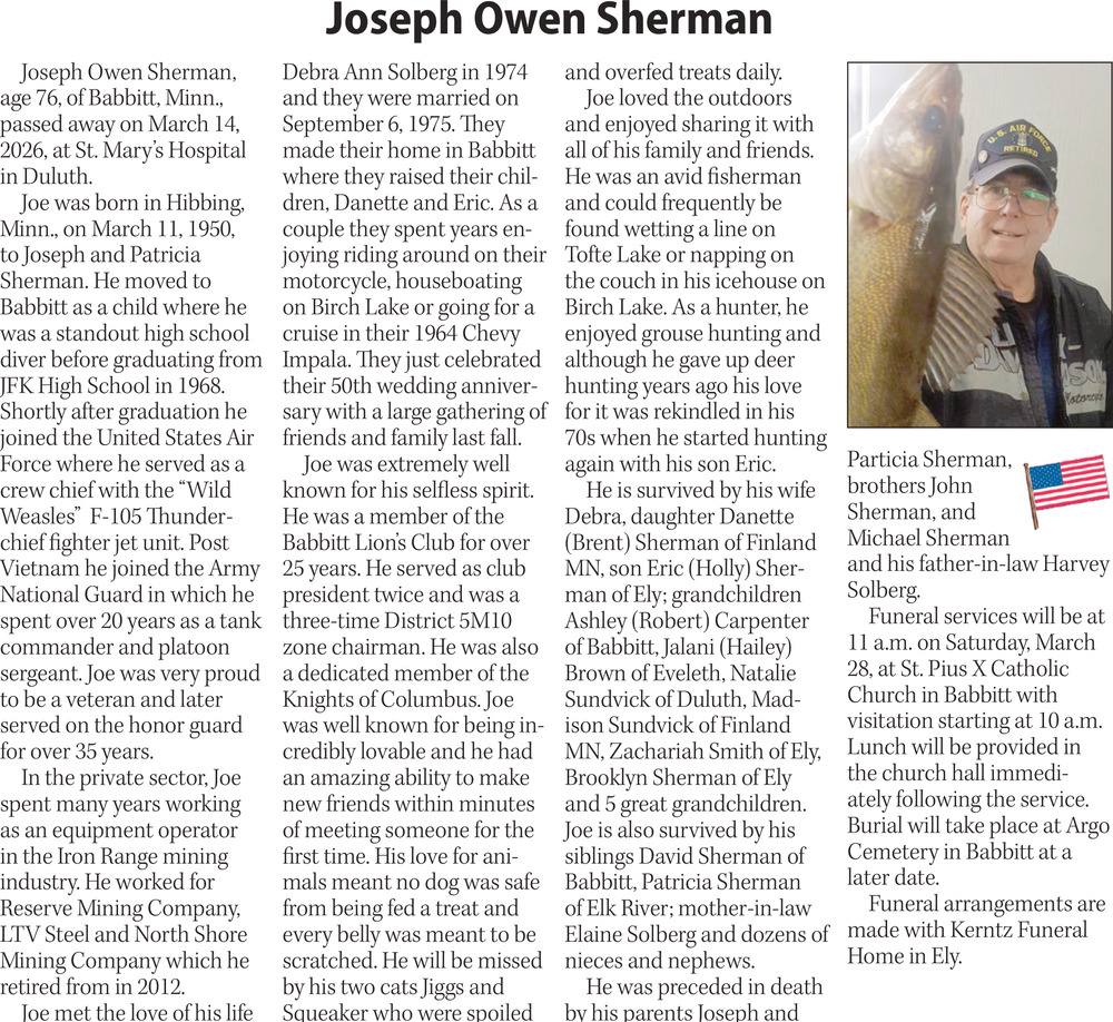 Mar 18, 2026. Kerntz Funeral Homes Funeral Ads from Mesabi Daily News
