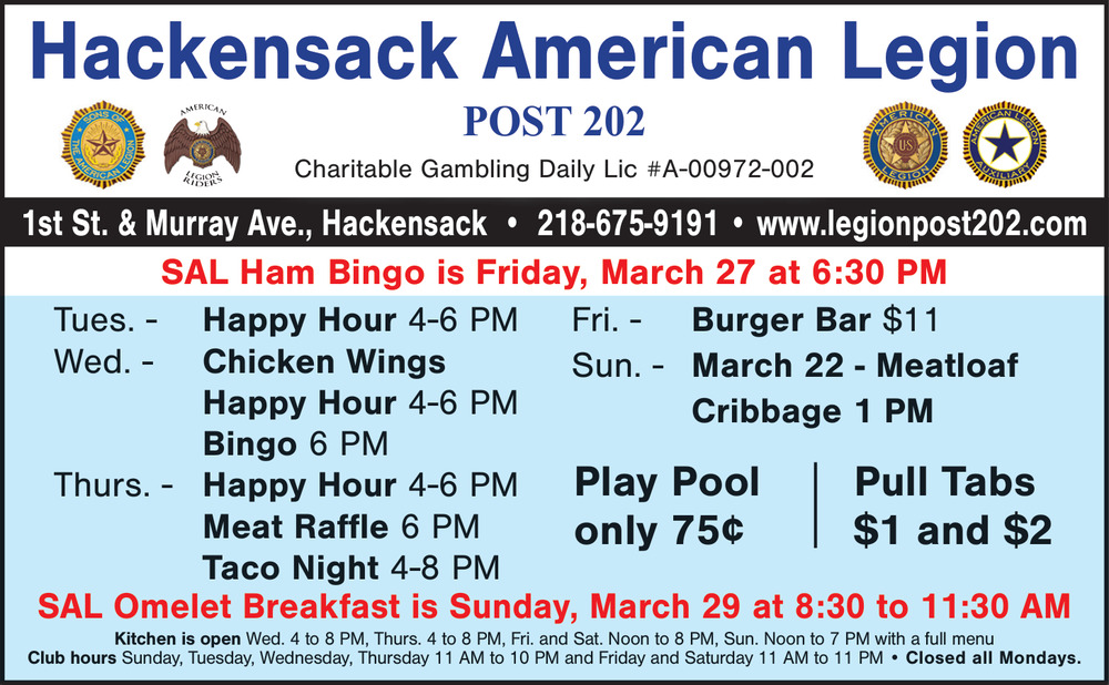 218-675-91911st St. & Murray AveHackensack, MN 56452(Legion)