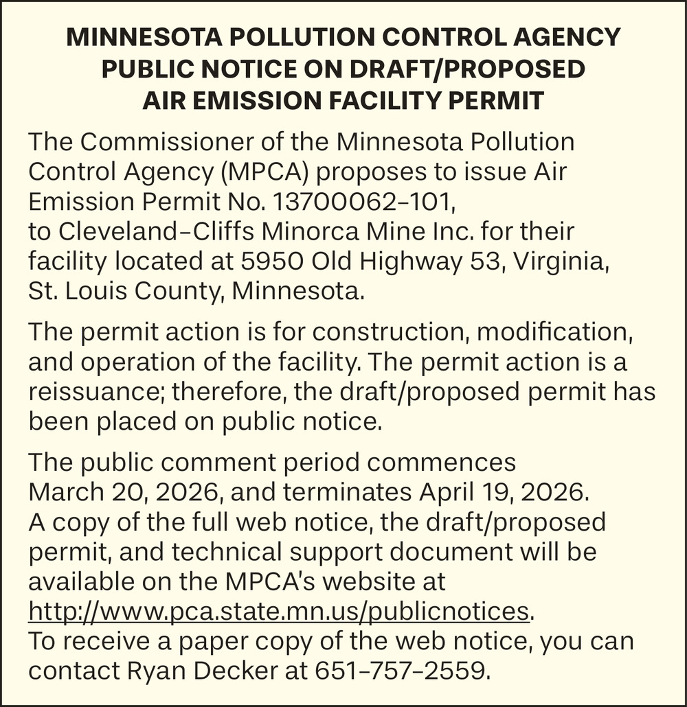 Mar 20, 2026. Minnesota Pollution Control Agency Notice Ads from Mesabi Daily News
