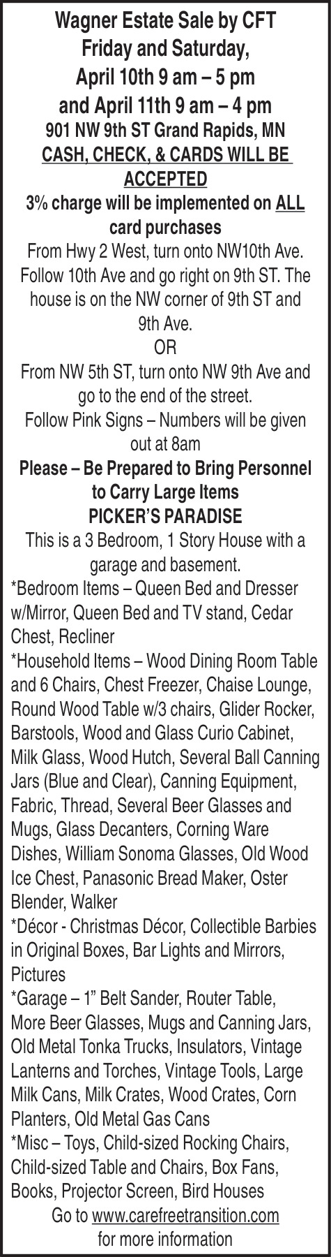 Apr 05, 2026. CareFree Transition Estate Sale Ads from Grand Rapids Herald-Review